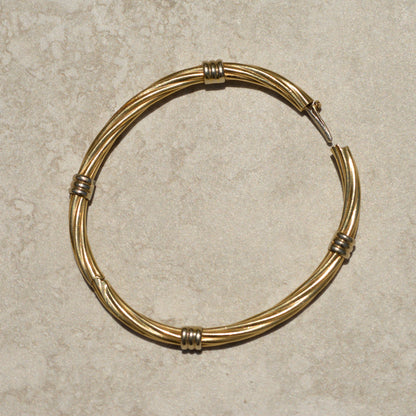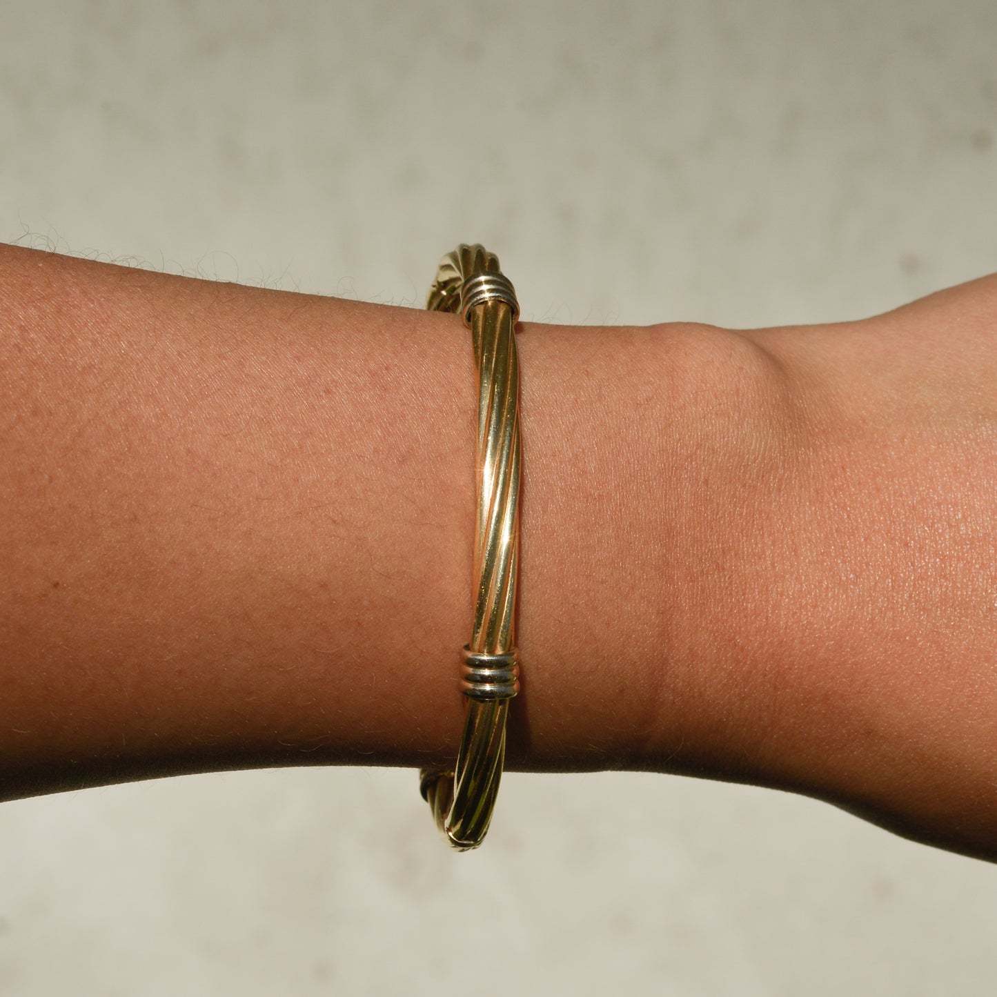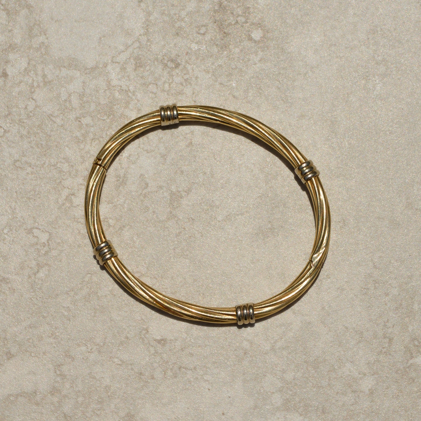 Vintage oval bangle with a twisted design in yellow gold and four white gold stations. 5 mm width.